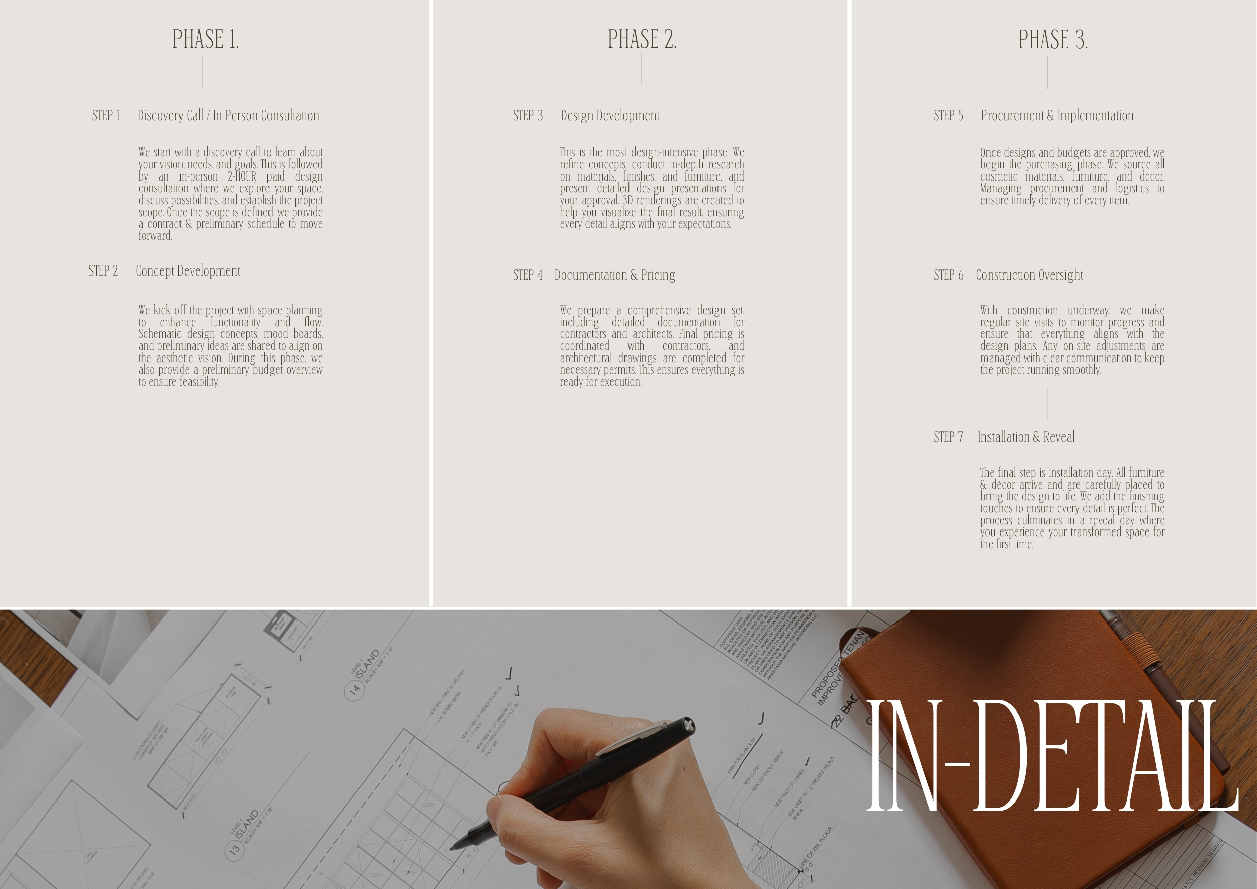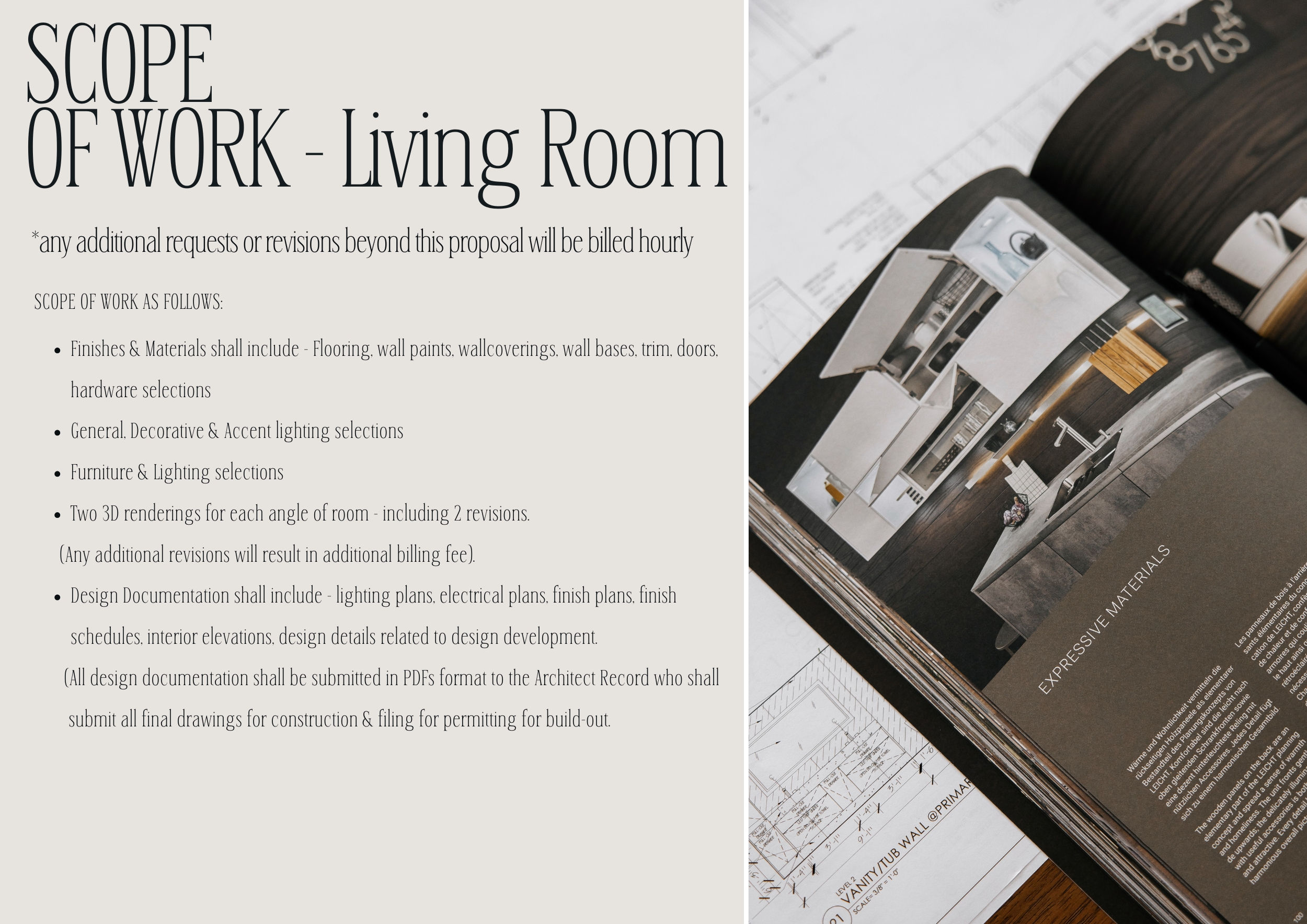 Then I include very detailed Scope of Work pages, because my design fees only cover the areas outlined in the proposal. Any additional spaces added beyond the original scope are priced as “Additional Services.” Full-service design should not be confused with all-inclusive services.