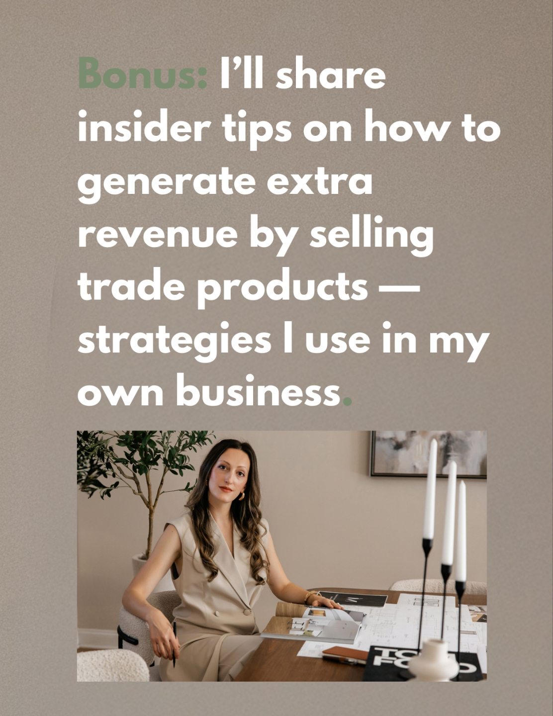 In this free 30-minute masterclass, I’ll teach you how to confidently price your work and profit from trade sourcing like a pro..Â